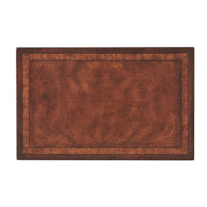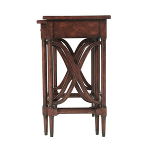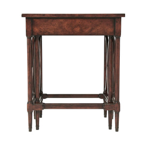 A nest of two antiqued mahogany tables, with crossbanded tops, turned legs with brass cappings and wavy 'X' stretchers to the sides, the smaller table fitted with a frieze drawer. Inspired by a 19th century English original.