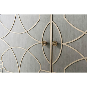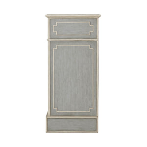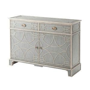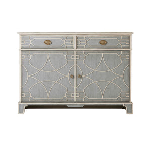 Chinese Chippendale Painted Cabinet, a vintage painted Chinese Chippendale style side cabinet with two blind fret carved frieze drawers with brass pull handles above two cabinet doors enclosing an adjustable shelf and raised on bracket feet.