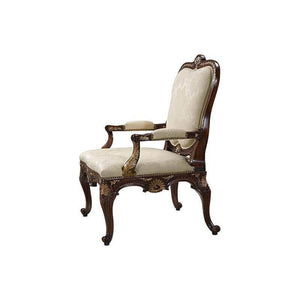 A hand carved mahogany framed, parcel gilt and upholstered chair, the serpentine trailing husk carved cartouche back centred by a floral carved crest, with padded arms and finely carved scroll uprights, enclosing an upholstered seat above a shaped, floral carved and fluted frieze, on carved cabriole legs terminating scroll feet.