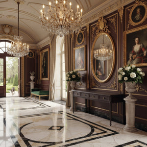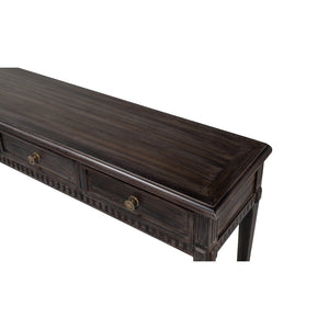 The Classic Long Console Table with Drawers blends timeless neoclassical influence with transitional versatility. Finished in a rich brown tone, this elongated console table is distinguished by its dentil-carved apron, tapered legs, and refined brass knob hardware. The design strikes a balance between elegance and practicality, offering a commanding presence for grand entryways, dining rooms, or long hallways.