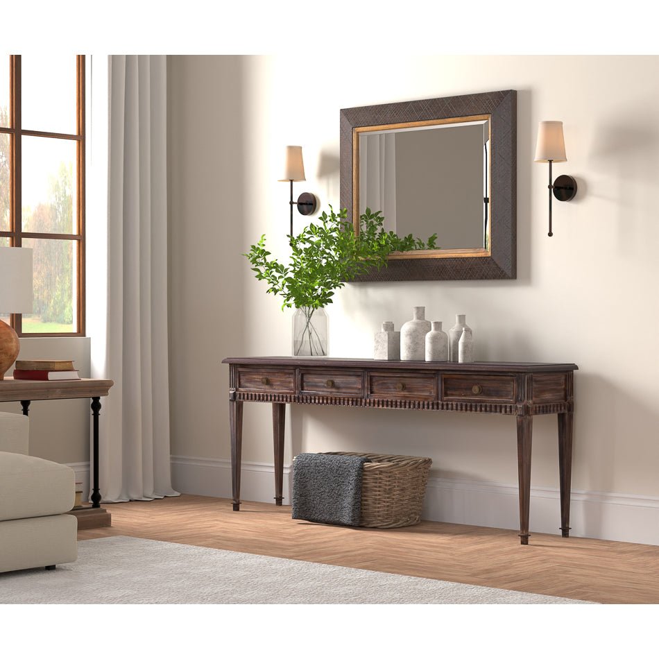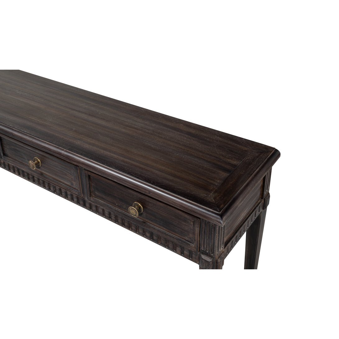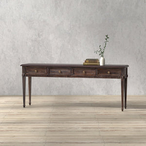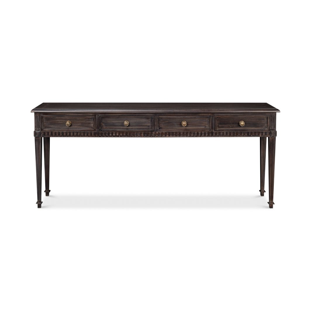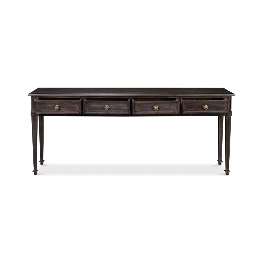 With four spacious drawers, it provides discreet storage for everyday essentials while maintaining a clean and symmetrical aesthetic. The dark transitional finish enhances its architectural details, making it suitable for both traditional and modern interiors. Graceful yet functional, this console captures the enduring appeal of classic craftsmanship in a streamlined form.