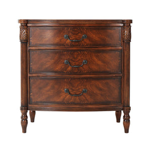 Federal Style Mahogany Bedside Chest, transform your bedside into a sophisticated, elegant retreat with this stunning mahogany nightstand. Crafted with exquisite attention to detail, this piece features a reeded edge bowfront top with beautifully carved leaf motifs, adding depth and texture to its design.