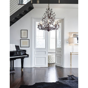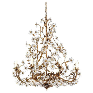 French Rococo rustic eight-light chandelier, the striking contrast of glass daisies with the gilt finish creates an organic feel and texture. Fabricated from a painted steel frame, with a patinated rust finish.