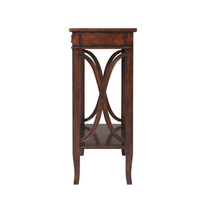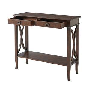 A French NeoClassic mahogany console table, the rectangular crossbanded and molded edge top above two frieze drawers, on square legs joined to the sides by wavy x stretchers and on splayed legs, joined by a crossbanded under tier.
