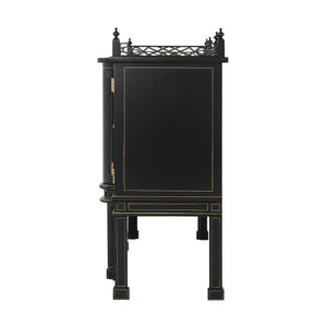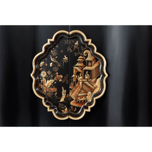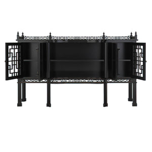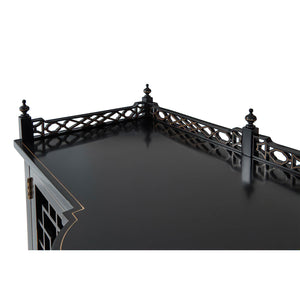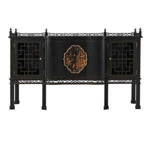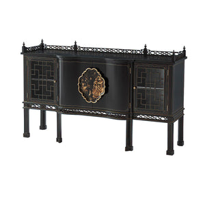 A masterful expression of Chinoiserie elegance, the George II Style Chippendale Sideboard showcases a refined fusion of Eastern-inspired motifs and English craftsmanship. Finished in a rich ebonized tone, this serpentine sideboard features a breakfront top crowned with an intricately pierced fretwork gallery. Two trellis fretwork doors flank a central pair of shaped doors adorned with an elaborate Chinoiserie-painted cartouche handle.
