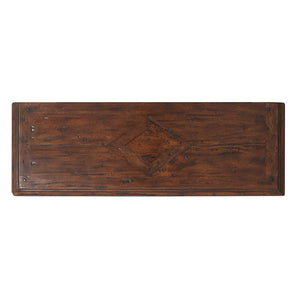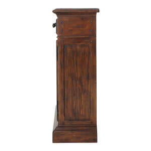 A George III style antiqued wood side cabinet, with two frieze drawers over two parquetry cabinet doors enclosing an adjustable shelf on a molded base with bracket feet.
