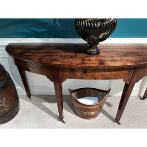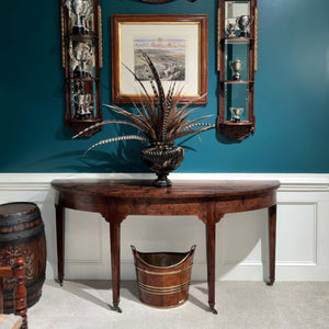 Elevate your interiors with the timeless sophistication of the Georgian Bowfront Console Table. Handcrafted from exquisite mahogany and reclaimed oak, this piece embodies classic refinement with a rich patina that speaks of history and heritage. The curved bowfront top rests upon a plain frieze adorned with delicate simulated corner brackets, offering a subtle yet striking visual balance. A discreet drawer enhances its practicality, making it as functional as it is beautiful. The table stands on square tapered legs, each terminating in classic brass castors.