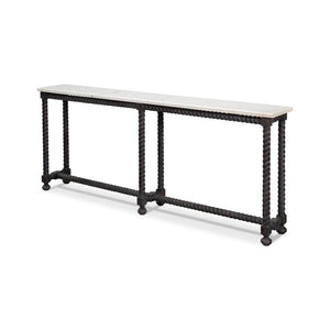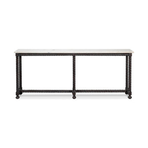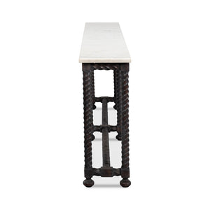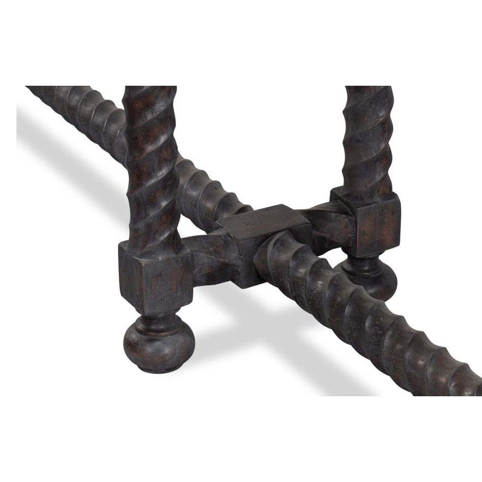 The base features intricately carved barley twist legs, a hallmark of 17th-century European design, lending movement and sculptural interest to the piece. Finished in a rich brown traditional style, the console evokes timeless character while maintaining versatility for today’s interiors. The combination of classic detailing and durable materials ensures this piece is both decorative and enduring.