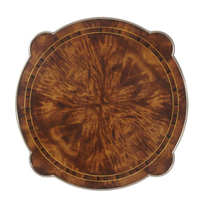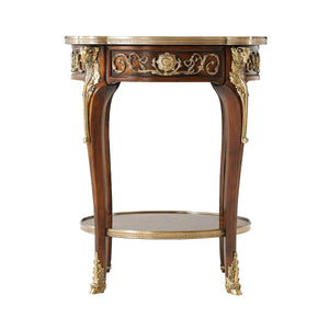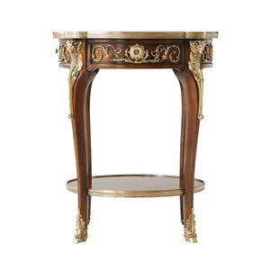 A Louis XV style mahogany and rosewood crossbanded lamp table, applied with very fine brass mounts, the brass bound circular top and undertier with protruding corners and a frieze drawer, on cabriole legs.