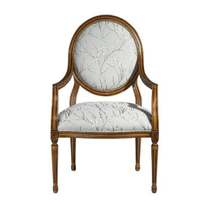A hand carved occasional chair, the moulded edge oval upholstered back with close nailed decoration and downswept arms enclosing an upholstered seat, on a moulded seat rail with flowerhead carved corners, on turned and fluted legs. Inspired by a Louis XVI original.
