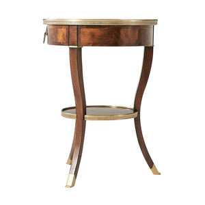 A timeless expression of classical refinement, the Neo Classic Round End Table is crafted from rich mahogany and accented with brass-bound details. The circular top is gracefully complemented by a single frieze drawer, ideal for keeping small essentials close at hand. Elegant inswept splay legs taper to brass sabots, joined by a matching brass-bound undertier for added functionality and sophistication.
