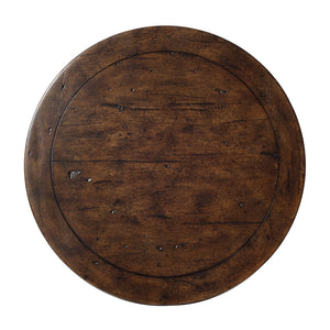 A round mahogany Industrial end table. The circular reeded edge top above a cluster column and four iron out swept legs.