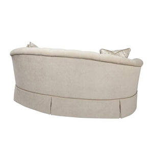 A curved back upholstered sofa, the tufted back leading to rolled arms above a loose cushion seat with two down throw pillows, on a skirted base. Inspired by a late 19th-century original.