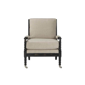 19th Century style spool turned armchair with a boxed cushion back, loose seat cushion and padded arms. The frame is finished in a dark espresso rubbed antiqued patina with antiqued brass casters.