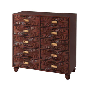 This Anglo Indian style chest of drawers radiates charm with ten starburst-relief carved drawers with campaign-style drawer handles, set on turned bun feet. Crafted in Mahogany and Mahogany veneers.