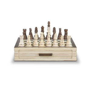 The set includes intricately designed chess pieces, finished in matching colors to enhance visual appeal and ease of play. The board sits atop a drawer for easy storage of game pieces.