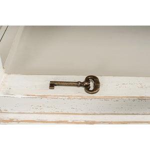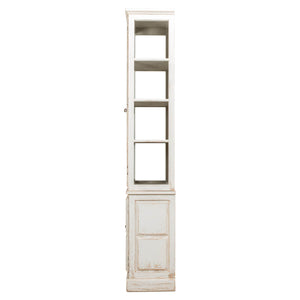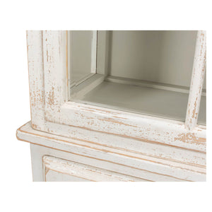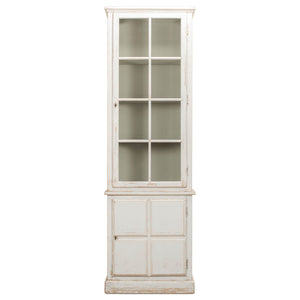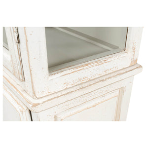 An antiqued white bookcase crafted with pine. This beautiful piece has a glass-paned upper cabinet with a painted grey interior and one lower cabinet with a door. It includes four removable shelves. This is a great piece for storage and display.