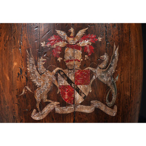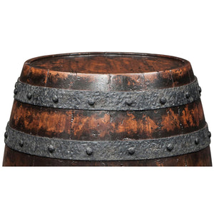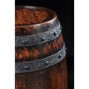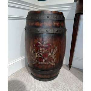 An antiqued wooden barrel, the circular top above planked sides bound by hand-forged iron riveted straps and hand-painted with the Spencer coat of arms.