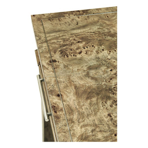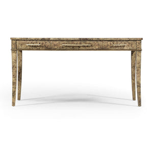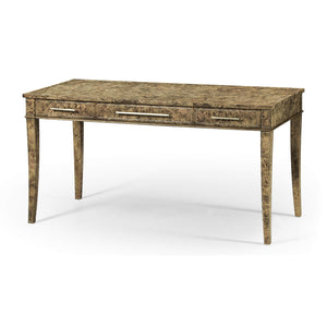 Art Deco style desk elegantly styled with golden amber burr veneer and three drawers with subtle stringing inlay. Raised on four tapering sabre legs.