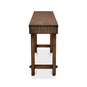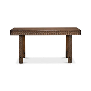 Artisan Carved Console Table - Featuring intricate geometric carvings that whisper tales of ancient craftsmanship. Fashioned in antiqued and distressed pine wood, this console table boasts a robust structure, promising to stand the test of time in both durability and style.