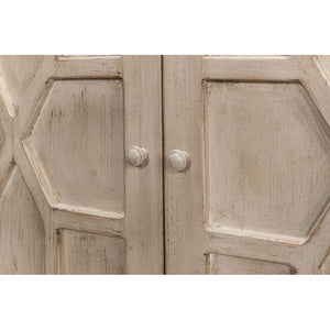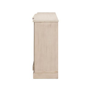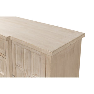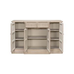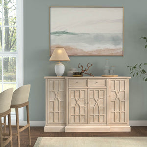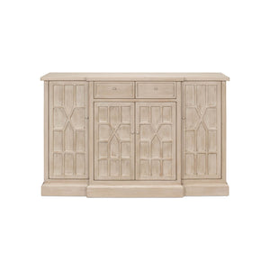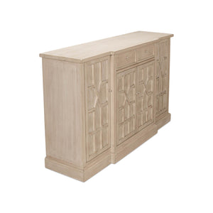 Blind Fret Breakfront Sideboard -This exquisite piece, with its classic breakfront form is crafted from pine and finished in a lightly distressed Stone gray finish. The intricate geometric Tudor-inspired pattern on the doors draws the eye, adding a dash of architectural finesse to its stately silhouette.