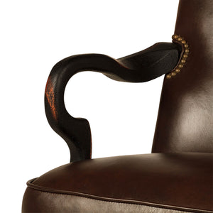 A custom leather office chair is made with top grain high-quality leathers with an exotic hair on hyde and chocolate brown. The high back office chair has natural brass nailhead details and the shepherd's crook arm is finished in our Buckingham glaze.