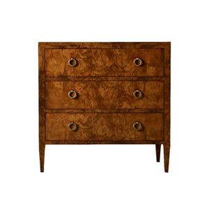 Indulge in the timeless classic of the Burl Walnut Three Drawer Chest, a true masterpiece of contemporary elegance. Impeccably crafted, this modern dresser seamlessly blends form and function, making it a must-have addition to any sophisticated living space.