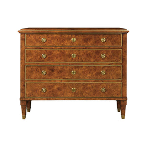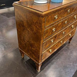 The four-drawer chest is wrapped in a gorgeous Birch burl veneer. An exotic figured wood with a high polish to highlight the movement and unusual details. The rectangular top and drawer fronts are framed with solid brass trim and the drawers have traditional-style brass ring pull handles.