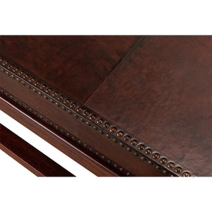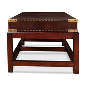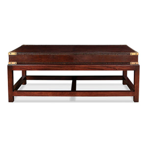 Crafted with an antiqued brown leather-wrapped lift top, the table exudes an air of classic elegance and sophistication. The brass-bound corners and nailhead trim details not only reinforce the table's durability but also enhance its aesthetic appeal, adding a touch of luxury and refinement.