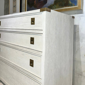 Campaign Style White Oak Nightstand, drawing inspiration from classic campaign furniture, this refined bedside chest combines traditional military aesthetics with contemporary craftsmanship. The white-painted oak construction features a carefully wire-brushed finish that emphasizes the wood's natural grain, while squared brass backplates and corner details pay homage to the original traveling furniture of British officers.