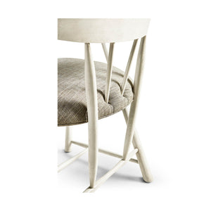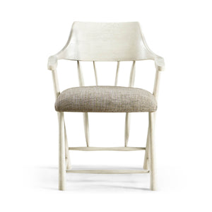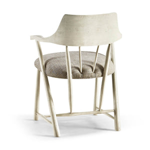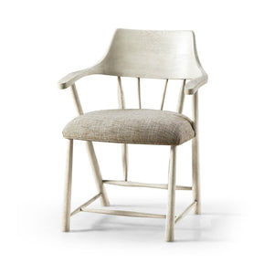 Captain's armchair - references to modern stylings and Scandanavian sentiments. The solid hardwood frame is finished in zinc white with interlocking supports for a clean and minimal aesthetic. An upholstered seat covered in Kravet fabric provides just the right amount of cushion while shapely wooden arms curve up to meet the swell of a mid-level back rest that delivers a posh and comfortable seating experience.