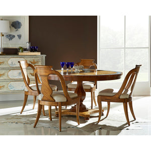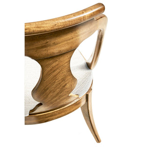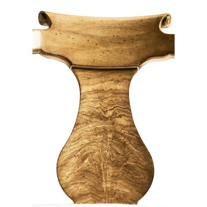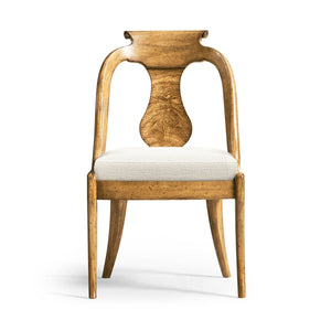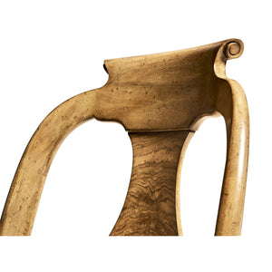 Featuring a gracefully curved urn form splat back adorned with exquisite figured Cerejeira veneers, known for their beautiful swirling patterns that captivate the eye. The veneers flow elegantly down the back, drawing attention to the chair's sophisticated silhouette.