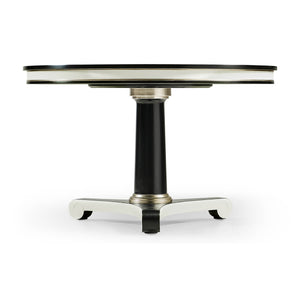 Classic Black and White Dining Table inspired by the Biedermeier era, with clean lines, classic vibes and versatility which make it suitable for a variety of settings - dining, foyer, office or living. The bold black and white lines are accented with silver leaf collars for the perfect amount of understated drama.