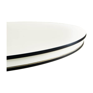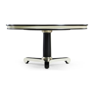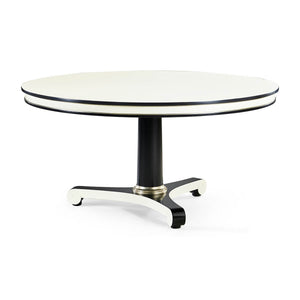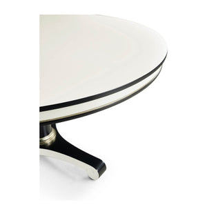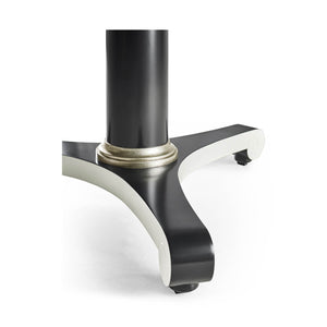 Classic Black and White Dining Table inspired by the Biedermeier era, with clean lines, classic vibes and versatility which make it suitable for a variety of settings - dining, foyer, office or living. The bold black and white lines are accented with silver leaf collars for the perfect amount of understated drama.