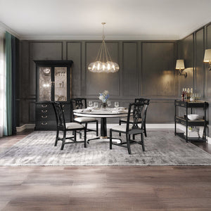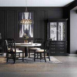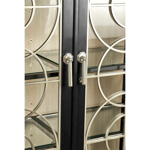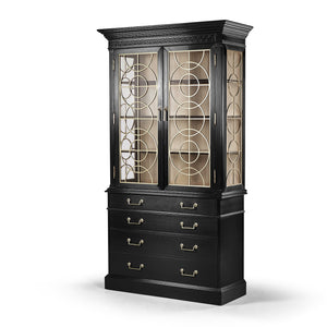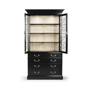 The Classic Black Display Cabinet blends timeless sophistication with functionality. Crafted from premium wood in a formal black finish, it features striking geometric metal accents on glass doors, showcasing collectibles elegantly. Blonde Koto veneers line the interior, enhancing its refined aesthetic, while the stepped cornice and carved details add architectural charm.
