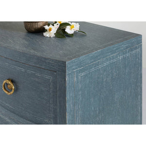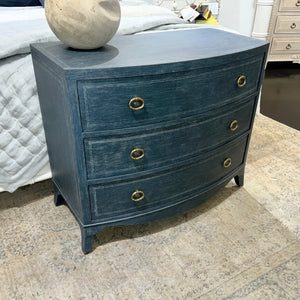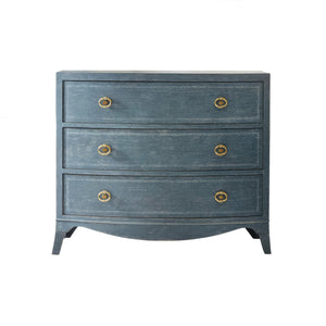 The Classic Blue Painted Bedside Chest embodies timeless elegance with its refined proportions and thoughtful details. The distressed blue painted finish creates an elegant, clean canvas that highlights its architectural elements, while a painted line inlay and decorative brass oval ring pulls add warmth and sophistication to each of the three soft close drawers. Traditional English Hepplewhite design elements, including gently splayed legs and a subtly curved apron, enhance the piece's classic appeal.