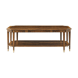 Eight tapered legs extend downward with quiet sophistication, each capped in brass ferrules that nod to Regency-era design. A lower shelf mirrors the top in both proportion and veneer, offering ample space for display or storage. This table makes a statement of heritage and refinement in any room.