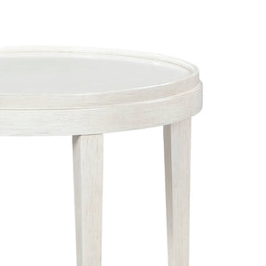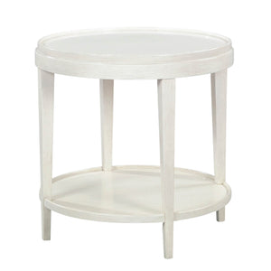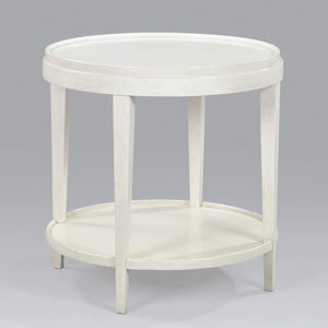 Classic Distressed White Round End Table. A classic style end table with a rustic and slightly distressed white painted finish. The two-tier side table with a wooden galleried dish top, with square tapered legs and a round shelf stretcher base.