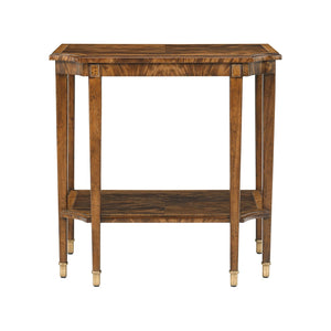 The Classic End Table is a study in elegance and proportion, capturing the grace of neoclassical English design in a compact, versatile form. Inwardly curved edges supply sculptural detail to the tabletop, showcasing a beautifully patterned crotch veneer. The top and lower shelf both feature rich grainwork that shimmers beneath a warm medium brown finish.