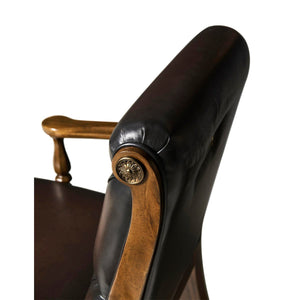 The chair has a durable mahogany frame, soft foam cushioning, and elegant brass details in a rich brown finish. Its design features a button-tufted rolled back for enhanced visual appeal and comfort, and hand-cast antiqued brass medallions that adorn the crown. A cleverly inset brass hand pull on the back allows for easy maneuvering.