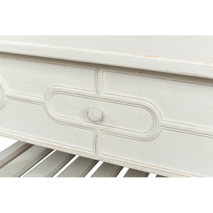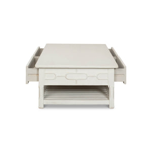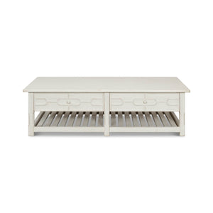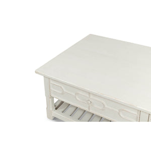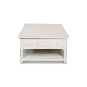 Painted Trellis Coffee Table in an antiqued white painted finish. This gorgeous table features a beautiful antiqued white painted finish that exudes old-world charm and elegance. The trellis details on the table are reminiscent of an English garden, adding a touch of nature to your living room.