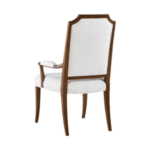 The Classic Upholstered Dining Armchair is a beautiful homage to English influence in 19th-century design, where elegance meets modern comfort. Slender saber legs and a sculptural wooden frame define the base, offering a delicate, graceful silhouette that grounds the chair in historical tradition. The medium brown stain highlights the natural beauty of the wood, lending warmth and richness to its formal profile.