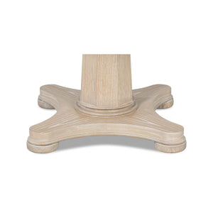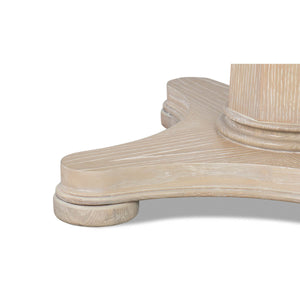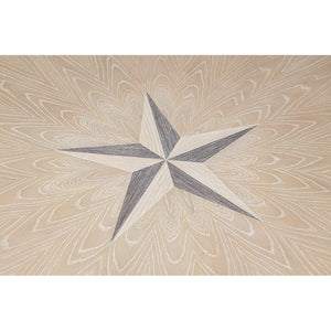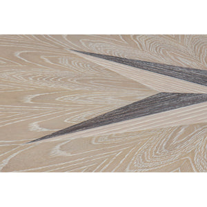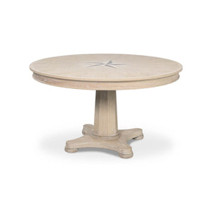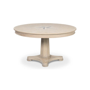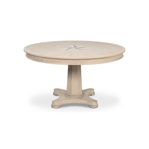 Classic Whitewash Round Dining Table, this stunning round oak table is a showcase of craftsmanship and elegance. Designed with a classical touch, the table features a beautiful nautical mariner starburst inlay at the center, creating a compelling focal point that draws the eye. The soft, whitewashed finish highlights the natural grain of the wood, giving it a rustic yet refined look.