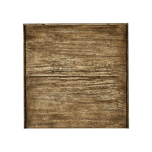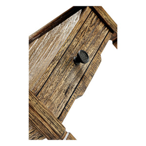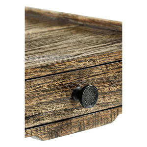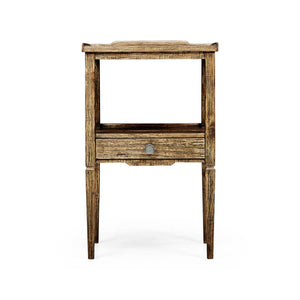 French two-tier lamp table, with a country-style medium driftwood heavily distressed finish on the square top above an under-tier with drawer and patinated brass handle.