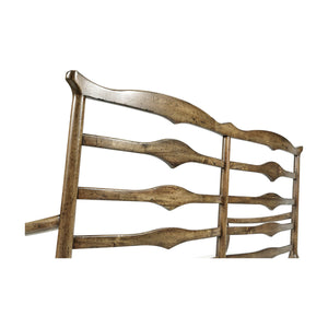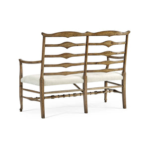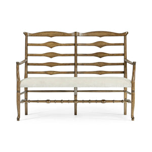 Country Ladder Back Bench, this English country-style medium driftwood ladder back two-seat bench has a shaped back rail, graduated ladder slats with triangular shaping in the center and an upholstered seat. Turned legs and stretchers beneath.
