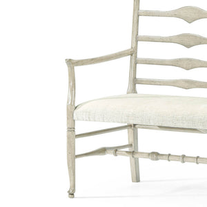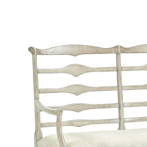 Country Ladder Back Bench, this English country-style whitewash driftwood ladder back two-seat bench has a shaped back rail, graduated ladder slats with triangular shaping in the center and an upholstered seat. Turned legs and stretchers beneath.