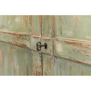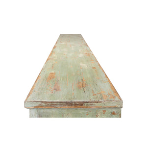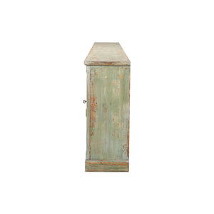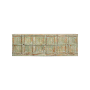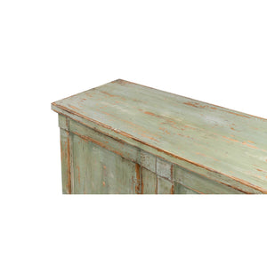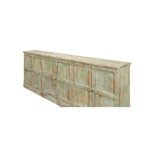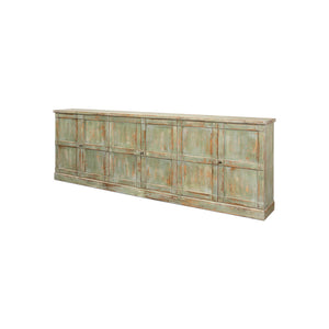 Country Sage Painted Sideboard, made of pine finished in a sage finish that is antiqued and distressed. With six doors, a rectangular form and a perfect depth of 15". The doors open to a painted interior with shelves. The cabinet is raised on a square plinth base.