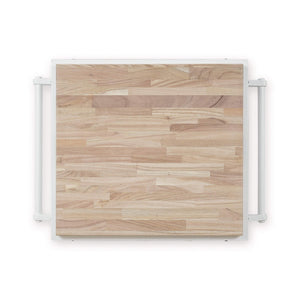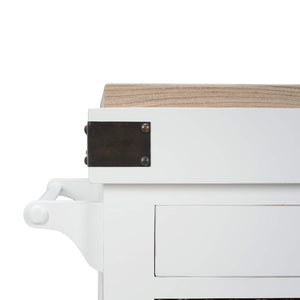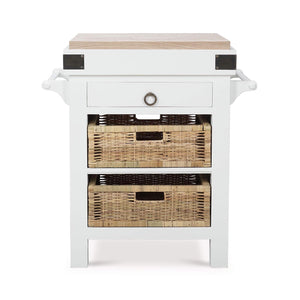 The kitchen island features a spacious butcher block top, perfect for food preparation. Below, a single drawer with a ring pull provides additional storage for your essentials. The two rattan baskets offer a rustic touch, adding ample space for kitchen items or decorative pieces. Side handles make it easy to move, ensuring this island is as practical as it is stylish.