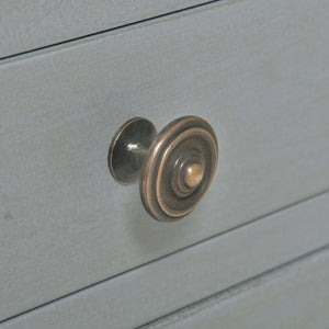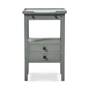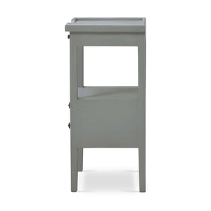 A pull-out shelf adds character and functionality. Made of solid mahogany with a pair of dovetailed drawers that create a lower shelf for an elegant display. The gorgeous Charleston Gray finish adds a sophisticated and serene touch that complements any decor style.