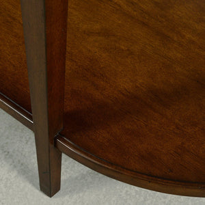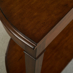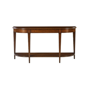 Rooted in timeless elegance, this Dark Wood Traditional Console Table brings a refined presence to any hallway, entry, or living space. The demi-lune silhouette is accentuated by a molded edge top and apron, showcasing graceful curves with classical inspiration. Square tapered legs support the design while the integrated stretcher shelf offers practical storage and balance to the overall composition.